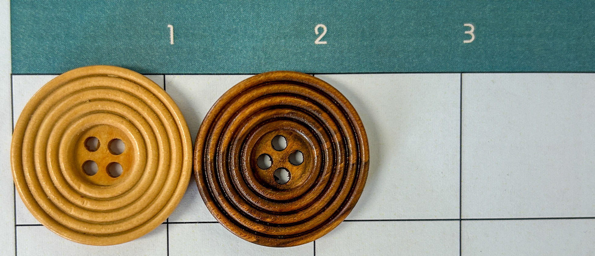 These wooden buttons feature a cool repeat pattern and varnished finish