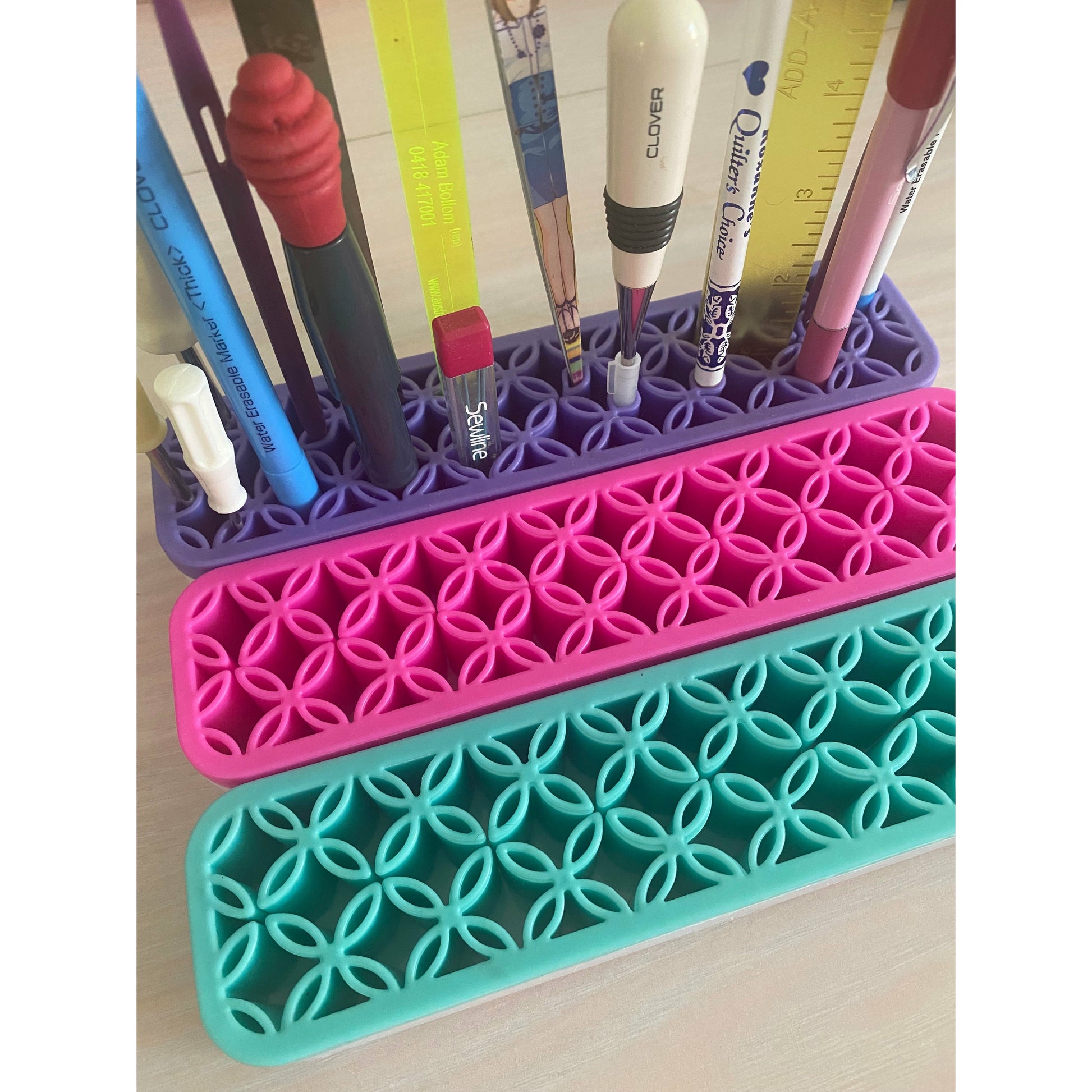 Store marking tools, scissors, stilettos, seam ripper, rulers, screwdrivers and small rotary cutters, in an easy-to-grab upright position.