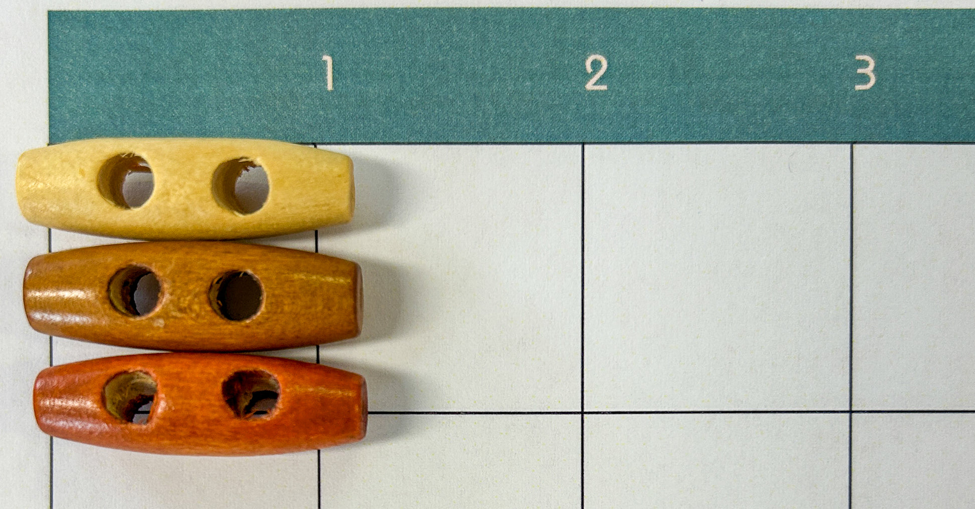 Double hole wooden toggle measuring approx 1.25 inches (3cm) in length.
